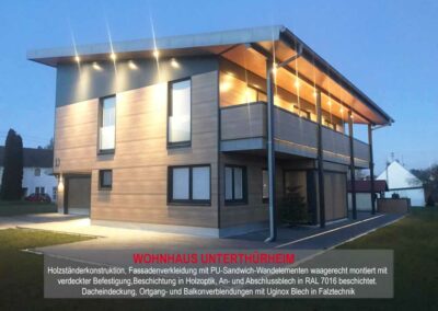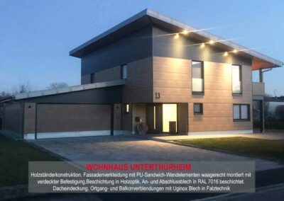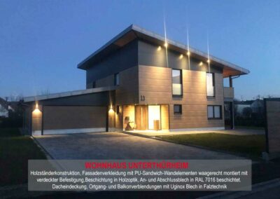 Für dieses Wohnhaus wurde eine moderne Fassadenverkleidung mit den ROMA Paneelen, Typ M120, umgesetzt. Die Paneele in der eleganten Holzoptik „Golden Oak“ sowie in der RAL-Farbe 7016 verleihen der Fassade eine zeitgemäße und natürliche Ästhetik. Alle Abschlussbleche wurden ebenfalls in RAL 7016 beschichtet, um ein harmonisches und einheitliches Erscheinungsbild zu gewährleisten.